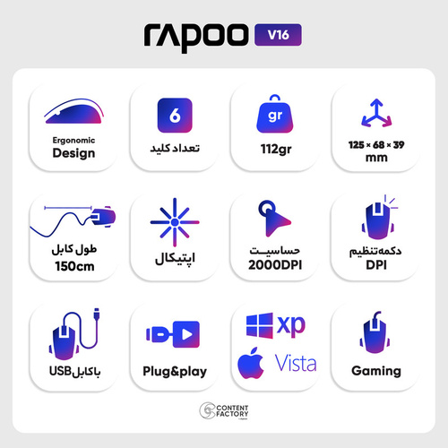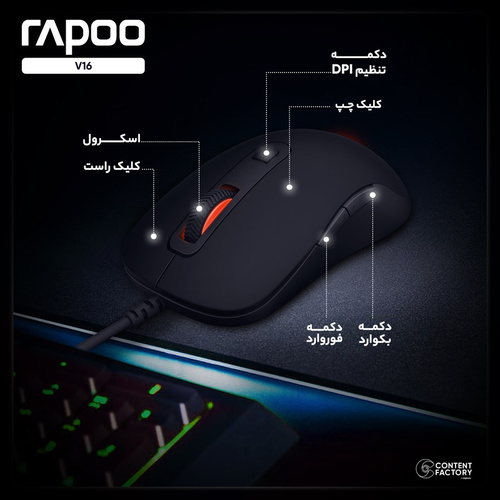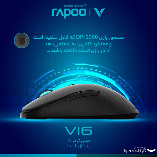 ماوس «V16» محصولی از شرکت «رپو» است که از طریق درگاه USB به رایانه متصل میشود. این ماوس دارای شش کلید برای انجام فعالیتهای کامپیوتری است که باعث سریعتر انجام پذیرفتن کارها میشود. شرکت رپو نوع سنسور اپتیکال با حداکثر دقت 2000 دیپیآی را برای ماوس V16 در نظر گرفته است. یکی از مهمترین فاکتورها برای بسیاری از کاربران سرعت انتقال اشارهگر ماوس از قسمتی به قسمت دیگر صفحهنمایش است. هر چه میزان DPI در یک ماوس مقدار زیادتری باشد، این سرعت هم بیشتر خواهد بود. در قسمت میانی دو کلید اصلی این ماوس یک کلید DPI به چشم میخورد که به کمک آن میتوان اقدام به کاهش یا افزایش DPI کرد. جنس بدنهی ماوس V16 از پلاستیک با کیفیت است که میتواند در برابر بسیاری از صدمات مقاومت خوبی از خود نشان دهد. کتابل اتصال در این ماوس دارای روکش الیافی است که میتواند در برابر گره خوردن و پارگی مقاوم باشد. اگر قصد تهیهی یک ماوس حرفهای با طراحی ساده را دارید، V16 انتخابی هوشمندانه برای شما خواهد بود.